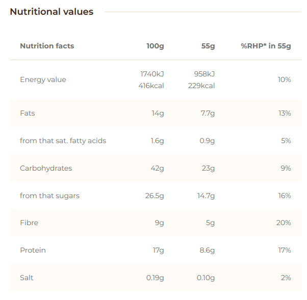 Състав: безглутенови овесени ядки (29%),БИО оризов сироп (27%),горски плодове (15%),соев протеин (12%),палмова мазнина, просо, БИО елда, соя, какаово масло, сол.